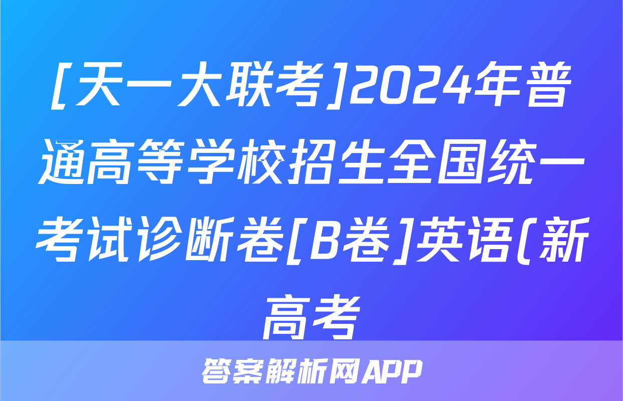 [天一大联考]2024年普通高等学校招生全国统一考试诊断卷[B卷]英语(新高考)答案正在持续更新,目前2026届海淀八模答案网为大家整理了相关试题及答案,供大家查缺补漏,高效提升成绩。